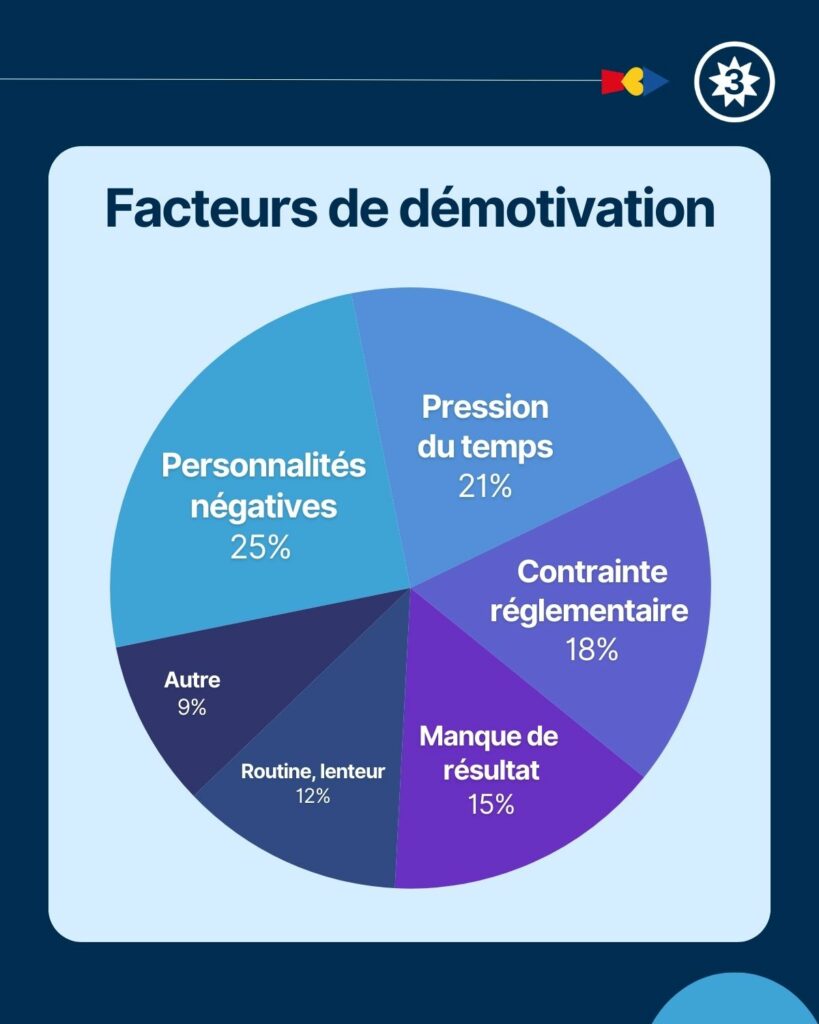 25% sont démotivés par les personnalités négatives. Rien de pire que l’énergie aspirée par les râleurs professionnels. Prenez le temps d’écouter les émotions et fixez des limites !